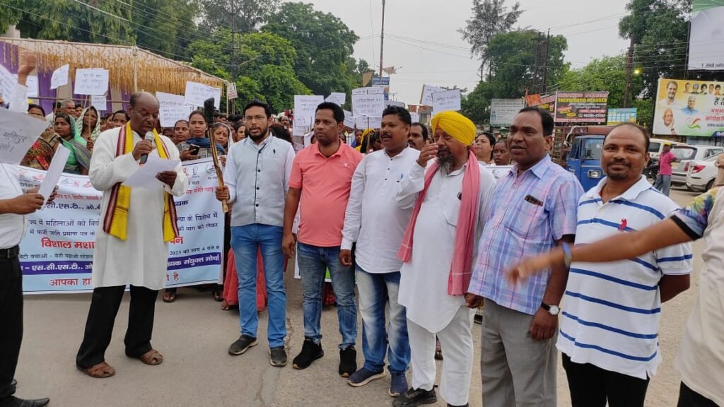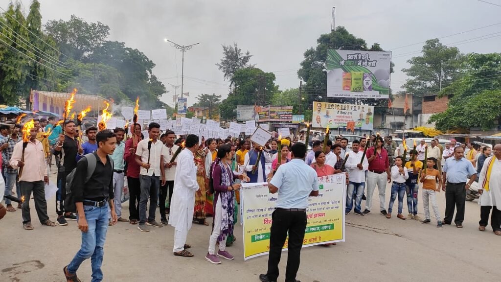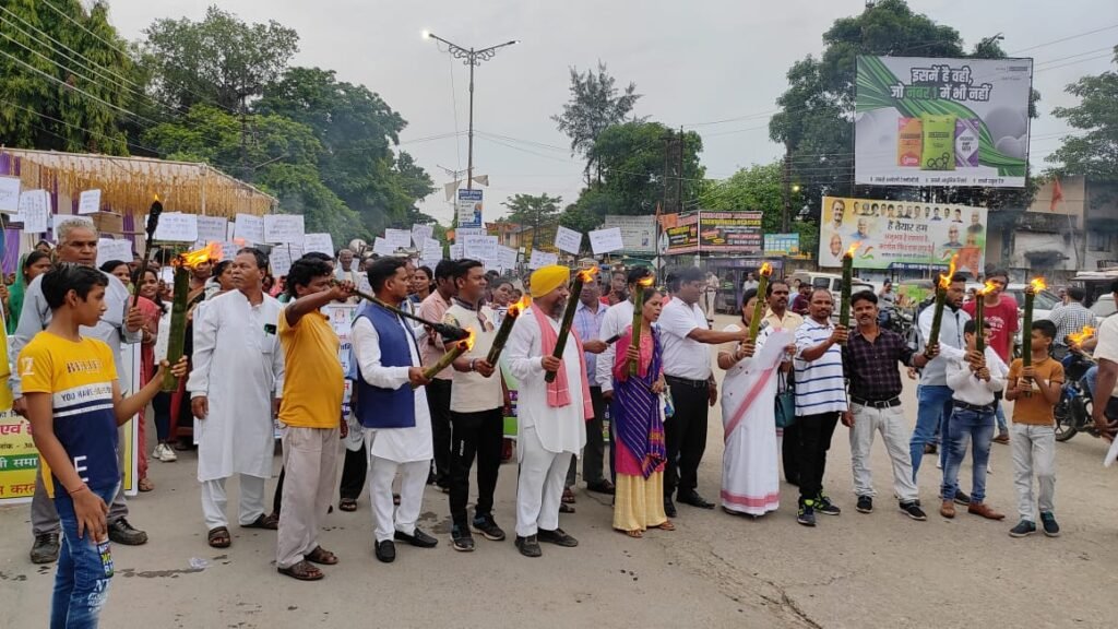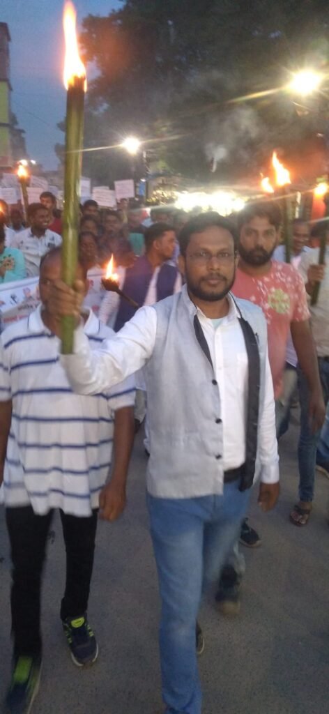 रायगढ़ / मणिपुर राज्य में आदिवासी महिलाओं को निर्वस्त्र घुमाने,सामूहिक ब्लातकार कर हत्या करने के विरोध में,छत्तीसगढ़ राज्य में फर्जी जाति प्रमाण पत्र के आंदोलन कारियों की निःशर्त रिहाई की मांग, सीधी जिले मे आदिवासी व्यक्ति के ऊपर पेशाब करने एवं शिवपुरी जिले मे अनुसूचित जाति के युवाओं को मैला खिलाने के विरोध मे आज संध्या विशाल मशाल रैली एवम ज्ञापन प्रशासन को बेटी बचाओ बेटी पढ़ाओ स्टेशन चौक रायगढ़ मेंदिया गया जिसमे अनुसूचित जाति,जनजाति,अन्य पिछड़ा वर्ग व धार्मिक अल्पसंख्यक समाज के सभी ऊर्जावान बुद्धिजीवी सहयोगी साथियों जो विभिन्न संगठनों का प्रतिनिधित्व करते है देश ,राज्य,जिला,ब्लाक,ग्राम स्तर पर शांति स्थापना, मानव समाज पर होने वाले हिंसा,अन्याय अत्याचार एवं शोषण महिला उत्पीड़न के खिलाप आवाज बुलंद करनें वाले महान गणमान्य नागरिक बंधुओं,बुद्धि जीवियों अधिकारी,कर्मचारियों, यूवाओं,महिलाओं,छात्राओं, सभी संगठनों के कार्य कर्ताओं,पदाधिकारियों की विशाल उपस्तिथि थी। यह मशाल रैली बेटी बचाओ,बेटी पढ़ाओ स्टेशन चौक रायगढ़ से में निकाली गई।जिसमे राष्ट्रपति महोदया,छत्तीसगढ़ के मुख्यमंत्री के नाम ज्ञापन भी सौंपा गया ।