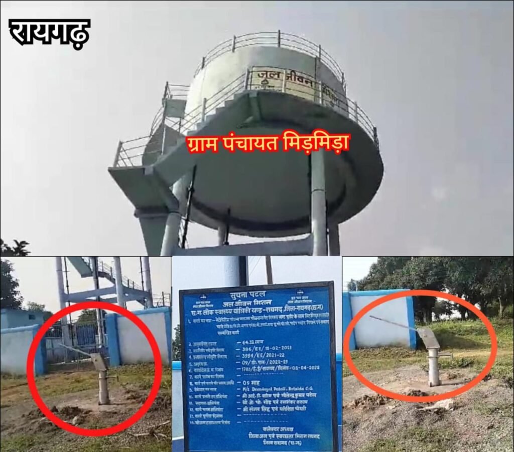 रायगढ़:- ग्राम पंचायत मिड़मिड़ा में वर्तमान सरपंच और सचिव की कार्यशैली से नाराज ग्रामीणों द्वारा जीवन मिशन में बरती जा रही लापरवाही और ग्राम पंचायत के अन्य विकास कार्य में किया जा रहे भ्रष्टाचार को लेकर मुखर हो गए हैं तथा पंचायत में चल रहे गड़बड़ झाले की पोल खोलते हुए कड़ी कार्यवाही करने जल्द ही उच्च अधिकारियों से मुलाकात करने की बात बोल रहे हैं। शनिवार की शाम एक वीडियो वायरल हुई है जिसमें ग्रामीणों ने आरोप लगाया है कि जल जीवन मिशन अंतर्गत ग्राम पंचायत मिड़मिड़ा में निर्मित पानी टंकी में जल भराव के लिए प्रस्तावित बोर खनन के बाद बोर मोटर न लगाकर, हैंड पंप (बोरिंग) लगा दिया गया है। ग्रामीणों ने सवाल उठाए हैं कि इतनी ऊंचाई पर स्थित हजारों लीटर की विशालकाय पानी टंकी को क्या हैंडपंप से पानी भरा जाएगा ?