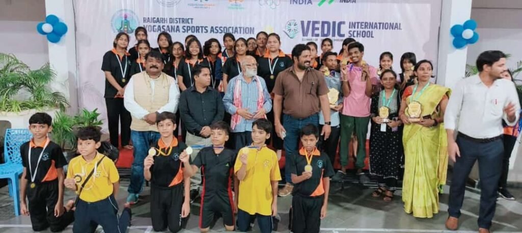 रायगढ़ पटेलपाली इंटरनेशनल वैदिक स्कूल में जिला योगा स्पोर्ट्स एसोसिएसन के तत्वावधान जिला स्तरीय योगा जूनियर वर्ग प्रतियोगिता समापन समारोह पूर्व डिप्टी डायरेक्टर नेहरू युवा केन्द्र भारत सरकार के बलबीर शर्मा, नागरिक सुरक्षा सेवा संगठन के राष्ट्रीय अध्यक्ष संस्थापक रेन्शी श्याम कुमार गुप्ता ,स्कूल के प्रिंसिपल एवं योगा एसो. प्रदेश एवं जिले के पदाधिकारियों के मुख्य आतिथ्य में सम्पन्न हुआ जहां अतिथियों के सामने कई योगा स्पर्धा एवं अतिथि सम्मान योगा प्रदर्शन किया गया तत् पश्चात सभी विजेता बच्चों को मेडल सर्टिफिकेट प्रदान अतिथियों द्वारा देते हुए आगे सलेक्शन की हार्दिक शुभकामनाएं दिया गया।