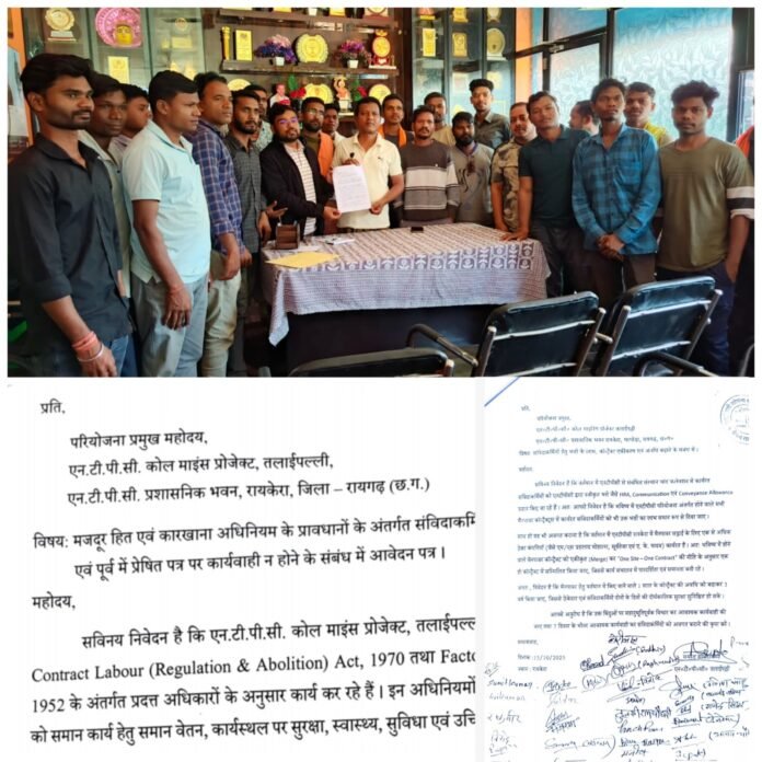 घरघोड़ा (रायगढ़)। एनटीपीसी कोल माइंस प्रोजेक्ट, तलाईपल्ली में कार्यरत संविदाकर्मियों ने मजदूर हितों की अनदेखी और पूर्व में दिए गए पत्र पर कोई कार्यवाही न होने के खिलाफ तीखी नाराजगी जताई है। संविदाकर्मियों ने परियोजना प्रमुख को पुनः स्मरण पत्र सौंपते हुए चेतावनी दी है कि यदि अगले तीन दिवस के भीतर कोई ठोस निर्णय नहीं लिया गया, तो वे अनिश्चितकालीन हड़ताल करने पर विवश होंगे।